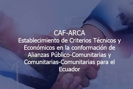 - Consultoría con la CAF-ARCA para el “Establecimiento de Criterios Técnicos y Económicos en la conformación de Alianzas Público-Comunitarias y Comunitarias-Comunitarias para el Ecuador”
